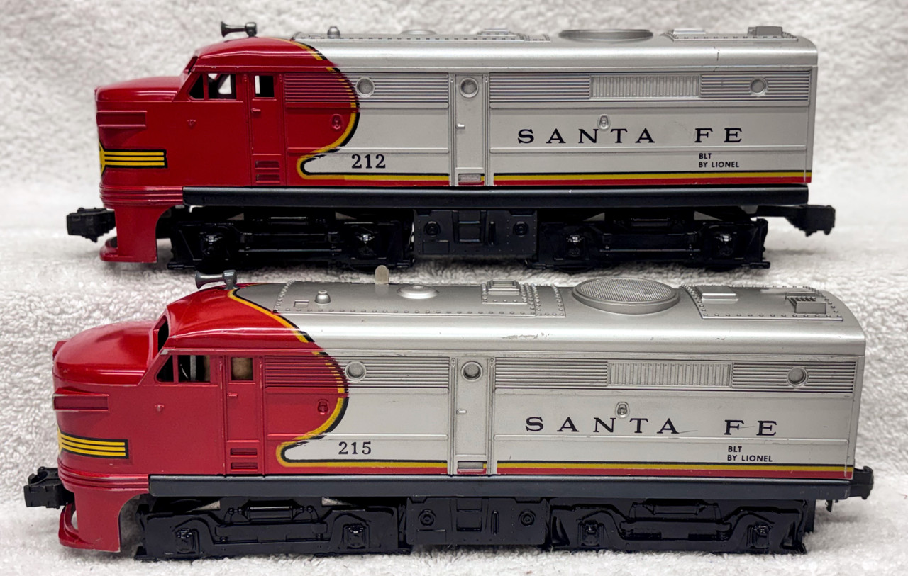 The Santa Fe 215 Alco diesels were an uncatalogued offering by Lionel in the mid-1960's. It is an interesting pairing of diesels as it represented Lionel's first offering where the power unit and trailer unit had different numbers on their cabs -- making the set far more realistic compared to earlier Alco models. The power unit was always numbered 215 on the cab. However, when sold as an AA unit, the trailer unit was numbered 212, but when sold as an AB unit the trailer unit was numbered 218.