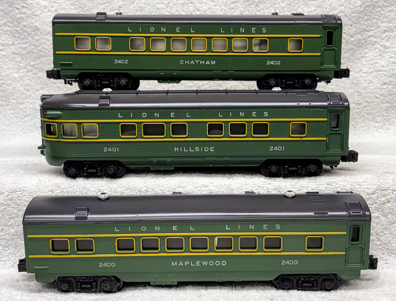 The 2400 Maplewood Pullman, 2401 Hillside Observation and 2402 Chatham Pullman passenger car set was manufactured for two year: 1949 & 1949. This three-car set is noteworthy in that it was Lionel's first injection-molded passenger car set ever produced! Additionally, Lionel designed the cars based upon the latest streamlined passenger cars introduced to the American rail system in the mid-1940s.